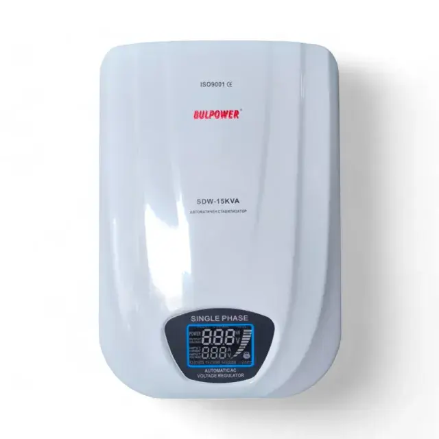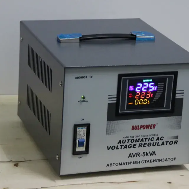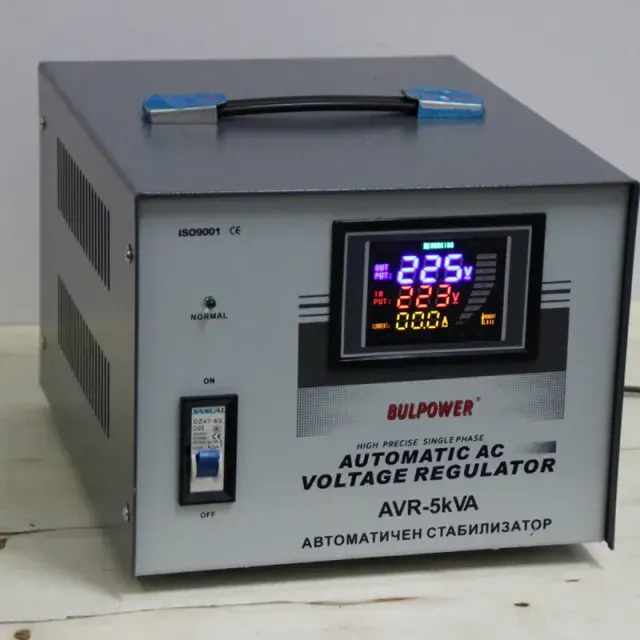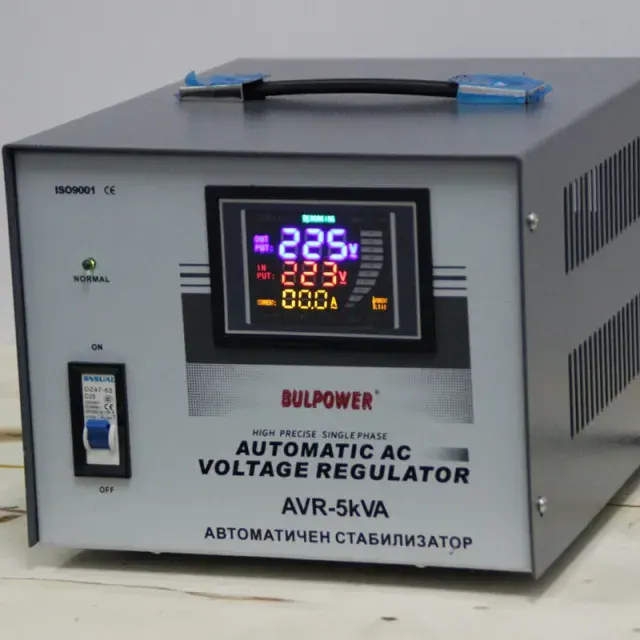 Представяме на вашето внимание новото поколение монофазни автоматични със серво мотор стабилизатори /регулатори/ за ток BULPOWER от ново поколение и мощност 5000 VA, цветен дисплей тип 3 в 1, показаващ волтажа на входящия ток, изходящия ток и моментната консумация /реално натоварване/ на включените в момента ел. уреди.Време за реакция 0 секунди /ZERO CROSS TRANSFER TECHNOLOGY/.Супер лесни за употреба, просто го включвате към мрежата и всичко се настройва автоматично, няма нужда от допълнителни настройки, както на стабилизаторите от по-старо поколение. Предназначението на тези машини е да осигуряват 230 волтово стабилно напрежение, благодарение на което осигуряват стабилна и безопасна работна среда на всички ел уреди, който са чувствителни към резки пикова или спадове в напрежението.Препоръчителни са за използване в специализирани лаборатории, сърварни помещения както и с прецизна медицинска апаратура с висока чувствителност. Автоматично стабилизира входното напрежение в диапазон 150-250V към постоянно и стабилно 230 волтово изходно напрежение.Нашите стабилизатори имат и допълнително 110 волтово изходно напрежение /Американски и Японски стандарт/за да можете да захранвате и машини закупени от Япония и Америка. Идеални са за употреба в региони, където напрежението от електропреносната мрежа е с отклонения и амплитудни колебания, или има смущения от промишлени консуматори (зони в близост до промишлени предприятия, селски райони или вилни зони).Препоръчителна е употребата на стабилизатор и със генератор за ток с цел избягване повреда на скъпи ел уреди и техника.Вградена двойна защита от претоварване, прегряване и късо съединение.При пад на напрежението до 150 V стабилизатора подава постоянно напрежение от 230 V. Стабилизатора предпазва всички ваши ел уреди от изгаряне токови удари и мълнии. Размери Д:29 Ш:24 В:20 см тегло 12 кг.