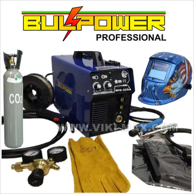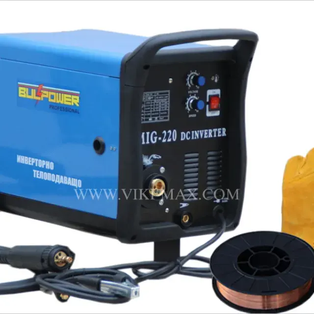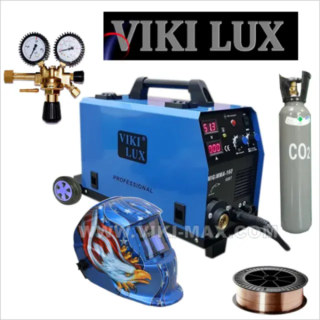 VIKI LUX MIG/CO2 – 220А професионални инверторни заваръчни апарати с вградено телоподаващо устройство+електрожен. С тях се заваряват всички черни метали, алуминий, неръждавейка, чугун, бронз и месинг. Окомплектовани са с еврошланг за МИГ/ММА заваряване, щипка маса, маска, чукче с четка,оригинални ръкавици за заваряване от телешка кожа. Регулиране на заваръчния ток/плавно/ 30-220 ампера, монофазни/220V/. Захранваща мощност: 5,2 kVA, Степен на защита: IP21. Работи с телове размери 0.6 , 0.8 и 1.0 мм и с ролки от 1 и 5 кг. Тегло – 13 кг. без ролка. Размери Д/Ш/В : 41/26/37 см.