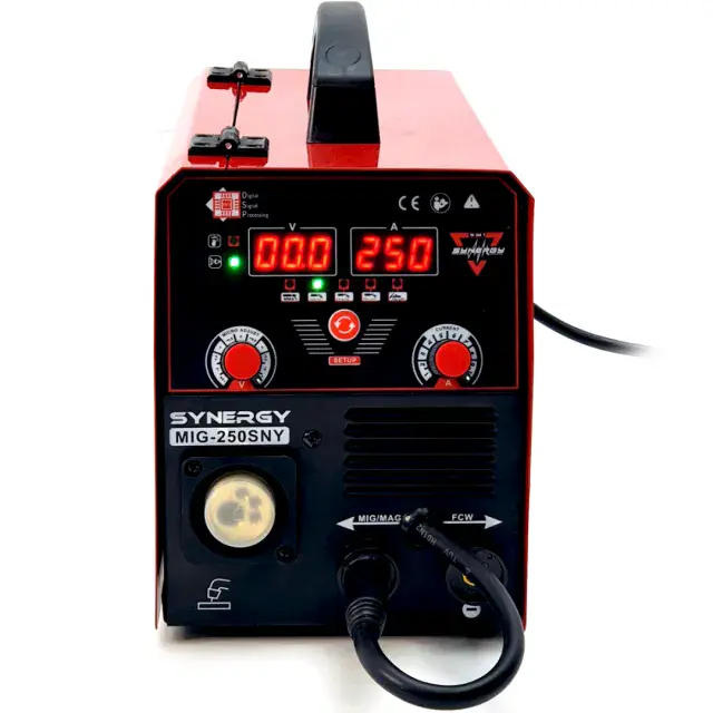 На базата на най-новата технология с вграден микропоцесор модела 250 SNY има изведени бутони на таблото за управление, с които задавате предварителни параметри на металите, които заварявате и машината регулира автоматично скороста на телоподаване и изходния ампераж. Изключително подходящо за начинаещи заварчици, понеже при правилно зададени параметри към микропроцесора няма опасност от прегаряне или нежелана деформация на материала.